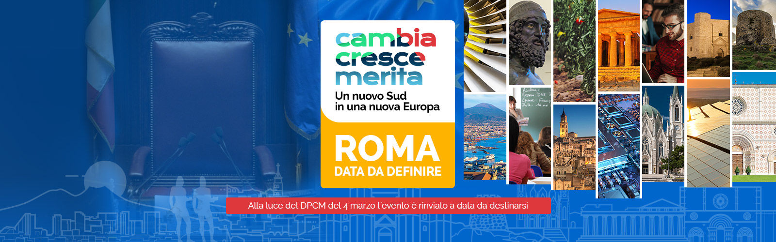 Il manifesto "Cambia, Cresce, Merita. Un nuovo Sud in una nuova Europa" arriverà a Roma con l’evento "Il futuro del Sud, il futuro del Paese - Merita incontra le Istituzioni". Come successo con gli appuntamenti di Napoli, Milano e Bari, anche a Roma vogliamo proporre una diversa narrazione del Meridione e immaginare insieme ai protagonisti delle istituzioni nazionali e locali un nuovo futuro per il Sud. Avremo il piacere di avere con noi il Presidente del Consiglio dei Ministri Giuseppe Conte.